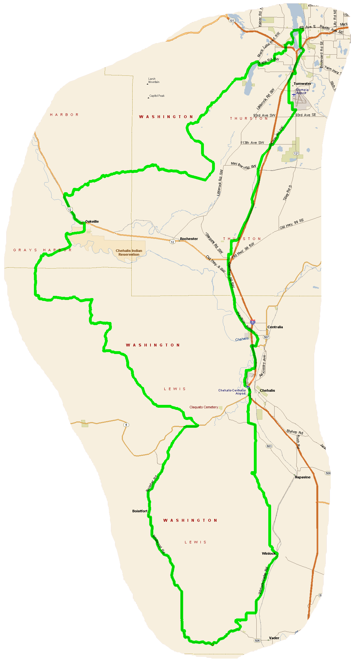 Please fill out the SIR Membership Form BEFORE the ride if you are joining SIR. Please also try to have correct change (or a check) for the entry fee, medal, SIR annual fee, and RUSA annual fee. Route Description: The route begins at the Fish Tail Brewpub in downtown Olympia. The route quickly escapes downtown with a short climb up from Capitol Lake and Tumwater hill and then heads south along the west shore of Black Lake and south-west through Capitol Forest. After the first control in Oakville, the route continues south on rolling rural roads through Curtis and Boisfort interspersed with a few nice climbs. The route reaches its southernmost point just outside Ryderwood and then flattens out heading east toward Vader and then north through Winlock, Chehalis, Centralia and back to Olympia. There are other places for food/water stops along the route besides the controls. These will be indicated on the final route sheet.