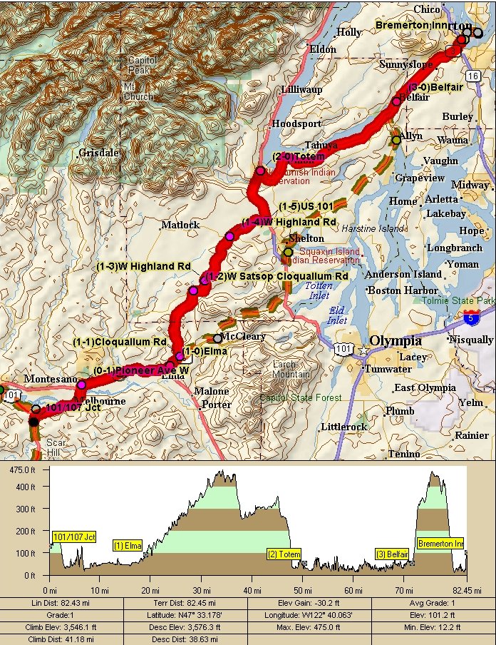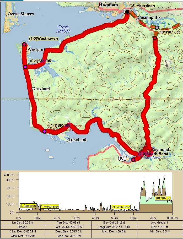 Special Instructions: Reach the Coleman Dock in downtown Seattle in time to catch the 6:00 a.m. ferry in order to make it to the start on time. Ferry schedule and information: http://www.wsdot.wa.gov/ferries/schedules/current/index.cfm?route=sea-br. If you miss the 6am ferry the next boat won't get you to Bremerton until more than an hour after the official start (in other words, too late). Note: Free on street parking is available south of the ferry terminal on Alaska Way, or about a mile north of the ferry terminal on Elliott Ave., just north of Pier 70 (N bound lane, at the Airborne Express HQ building). Or, ride your bike to the ferry. If you are driving to the start: Please park at the Best Western or the grocery store next door and ride to the start. Eric Vigoren will be at the Bremerton Starbucks to register riders who are not coming over on the ferry. Equipment needed: Remember riding gear for inclement weather, bike tools, spare tubes, and food/water for yourself. All riders should be familiar with the SIR Brevet Riders Expectations - see http://www.seattlerandonneur.org/member/SIR_rider_expectations.html Headlights (white and clearly visible from 150 yards to oncoming traffic), tail lights, and red rear reflectors are required. Note that many taillights are also legal reflectors. These may be checked and riders disqualified if they do not function. Functional lights must be mounted on bike at all times. Lights must be operating at night on each bike in a group. Blinking taillights are permitted, but note that these may bother other riders. Reflective vests or sashes and leg bands are required for riding at night or during poor visibility. This is for your safety and others in the group. Hand held flashlights or helmet mounted lights are recommended for repairs made in the dark. As a courtesy to other riders, fenders (with 1/4 coverage front wheel and 1/2 coverage rear wheel) are recommended. Additional rear splashguards are recommended for group riding. Route Description: The Spring 400k features a fairly flat route, a mix of busy and less-traveled roads and the chance to see the breakers of the Pacific Ocean and the shores of Puget Sound. From Bremerton the route heads southwest on Hwy 3 through Shelton. After Shelton you'll take Hwys 101, 108 and backroads to Elma and Montesano before heading south on Hwy 107 to avoid the busy road into Aberdeen. South of Cosmopolis the route heads northwest on Hwy 101 and then west on Hwy 105 all the way to the ocean (Westport). From Westport you'll head south along the coast on the lightly-chipsealed Hwy 105, around the north side of Willapa Bay, all the way to Raymond and South Bend. After having reached the southwestern tip of the route, the return to Bremerton is via Hwy 101, the recently-traveled Hwy 107 and backroads of Elma and then fresher roads to Potlatch, Hwy 106 along the south edge of Hood Canal and back onto Hwy 3 to Bremerton. The finish will be at the Best Western in Bremerton, not at the ferry dock! End of the ride: The finish will be at the Best Western in Bremerton (~2.5 miles from the ferry terminal). This is to accomodate the vast majority of riders who will finish during the five-and-a-half hour gap between boats in the middle of the night. SIR will have four rooms available with a variety of flat and/or soft surfaces to lie on. Three rooms will have kitchens and we'll do our best to accomodate everyone comfortably. If you would like to leave a small bag with a toothbrush or other toiletries with the organizers, you are welcome to do so. "Small" means a bag you'd be comfortable carrying with you on your bicycle.