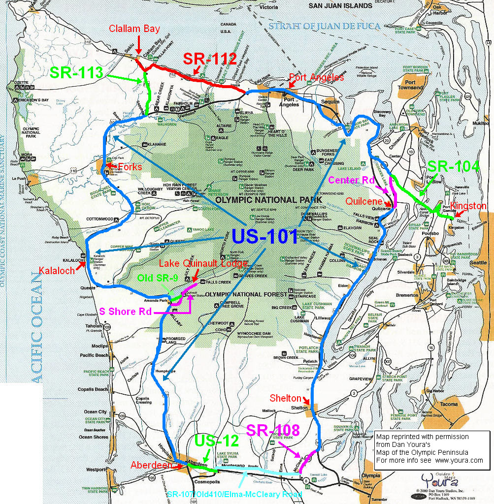 If you are planning on doing the 600 km please send an email to: Jon Muellner and let him know. We are trying to get a rough estimate of participants for the brevet. If you are thinking of spending the night in Kingston you can visit this site for info on lodging options. View map of the Olympic Peninsula 600 km route here. (480Kb JPG) Fee Structure Explanation for joining SIR: You don't have to be a SIR member to paticipate, but we encourage you to join us! The costs are only $8.00 to join SIR with email-notice-only of events member, or $15.00 to join SIR as a regular, U.S. mail-notice-of-events member. Also, all SIR members must join Randonneurs USA (RUSA) to ride. RUSA cost is $20.00 annually. Special Instruction: Reach the ferry terminal in Edmonds in time to catch the 5:50 a.m. ferry in order to make it to the start on time. Ferry schedule and information: http://www.wsdot.wa.gov/ferries/schedules/current/index.cfm?route=ed-king. Equipment needed: Remember riding gear for inclement weather, bike tools, spare tubes, and food/water for yourself. All riders should be familiar with the SIR Brevet Riders Expectations. Headlights (white and clearly visible from 150 yards to oncoming traffic), tail lights, and red rear reflectors are required. Note that many taillights are also legal reflectors. These may be checked and riders disqualified if they do not function. Functional lights must be mounted on bike at all times. Lights must be operating at night on each bike in a group. Blinking taillights are permitted, but note that these may bother other riders. Reflective vests and leg bands are required for riding at night or during poor visibility. This is for your safety and others in the group. Hand held flashlights or helmet mounted lights are recommended for repairs made in the dark. As a courtesy to other riders, fenders (with 1/4 coverage front wheel and 1/2 coverage rear wheel) are a must or you'll face the scorn and abuse of your fellow randonneurs. Additional rear splashguards are recommended for group riding. Helmets are required on all SIR events. Ride Beginning: Kingston Ferry Terminal, commuter lot on right at Ohio St. (one block up from ferry landing on right) Bag Drop: There will be one bag drop in Aberdeen only at the overnight. Make sure Mark has your small bag at the start. Bag drop bags will not be back to Kingston before 1:00 p.m. Ride End: Drifter Galley in Kingston on right open for food from 07:30 to 21:00, SIR manned afterwards. Route Description: Same route from 2002 Fall 600 km. We will make a complete circuit of the Olympic Peninsula. From the start in Kingston, we'll head across the Hood Canal Bridge and follow SR-104 and US-101 to Port Angeles. From there we'll take the Strait of Juan de Fuca Highway (SR-112) to Clallam Bay and then south on SR-113 back to US-101. The route passes through Forks, Kalaloch, and Quinault Lodge on the way to the overnight stop in Aberdeen. From Aberdeen we go east on US-12 and back roads (SR-107 and SR-108) to McCleary and Kamilche, where the route picks up US-101 N again. Head up the west side of the Hood Canal back to the bridge and the finish at Kingston at the Drifter Galley restaurant. Route Sheet