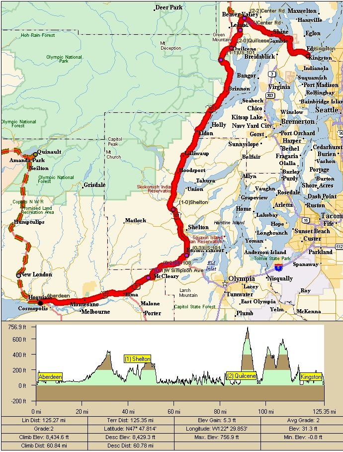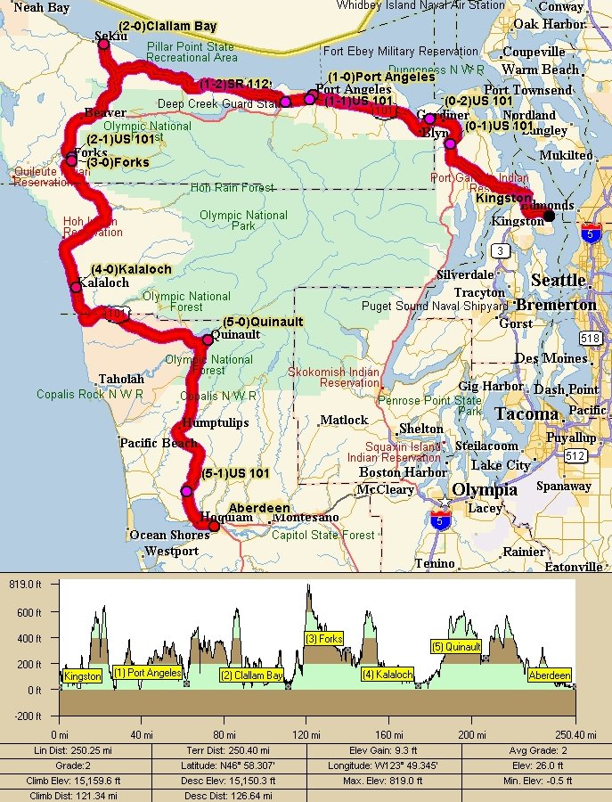 If you are planning on doing the 600 km please send an email to: Peter Beeson and let him know. We are trying to get a rough estimate of participants for the brevet so that we can plan for hotel rooms and "overnight" baggage transport. (If you are thinking of spending the night in Kingston you can visit this site for info on lodging options). View map of the Olympic Peninsula 600 km route here. (480Kb JPG) Fee Structure Explanation for joining SIR: You don't have to be a SIR member to paticipate, but we encourage you to join us! The cost is only $10.00 to join SIR. Please fill out the SIR Membership Form. Also, all SIR members must join Randonneurs USA (RUSA) to ride. RUSA cost is $20.00 annually. Special Instruction: Reach the ferry terminal in Edmonds in time to catch the 5:50 a.m. ferry in order to make it to the start on time. Ferry schedule and information: http://www.wsdot.wa.gov/ferries/schedules/current/index.cfm?route=ed-king. Equipment needed: Remember riding gear for inclement weather, bike tools, spare tubes, and food/water for yourself. All riders should be familiar with the SIR Brevet Riders Expectations. Headlights (white and clearly visible from 150 yards to oncoming traffic), tail lights, and red rear reflectors are required. Note that many taillights are also legal reflectors. These may be checked and riders disqualified if they do not function. Functional lights must be mounted on bike at all times. Lights must be operating at night on each bike in a group. Blinking taillights are permitted, but note that these may bother other riders. Reflective vests and leg bands are required for riding at night or during poor visibility. This is for your safety and others in the group. Hand held flashlights or helmet mounted lights are recommended for repairs made in the dark. As a courtesy to other riders, fenders (with 1/4 coverage front wheel and 1/2 coverage rear wheel) are a must or you'll face the scorn and abuse of your fellow randonneurs. Additional rear splashguards are recommended for group riding. Helmets are required on all SIR events. Ride Beginning: Kingston Ferry Terminal, commuter lot on right at Ohio St. (one block up from ferry landing on right) Bag Drop: There will be one bag drop in Aberdeen only at the overnight. Make sure the organizer has your small bag at the start (Small means you can carry it with you while riding). Bag drop bags will not be back to Kingston before 1:00 p.m. Ride End: Drifter Galley in Kingston on right open for food from 07:30 to 21:00, SIR manned afterwards. Route Description: Same route from 2003. We will make a complete circuit of the Olympic Peninsula. From the start in Kingston, we'll head across the Hood Canal Bridge and follow SR-104 and US-101 to Port Angeles. From there we'll take the Strait of Juan de Fuca Highway (SR-112) to Clallam Bay and then south on SR-113 back to US-101. The route passes through Forks, Kalaloch, and Quinault Lodge on the way to the overnight stop in Aberdeen. From Aberdeen we go east on US-12 and back roads (SR-107 and SR-108) to McCleary and Kamilche, where the route picks up US-101 N again. Head up the west side of the Hood Canal back to the bridge and the finish at Kingston at the Drifter Galley restaurant. Route Sheet